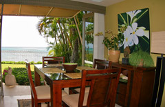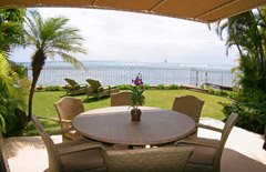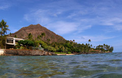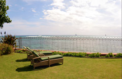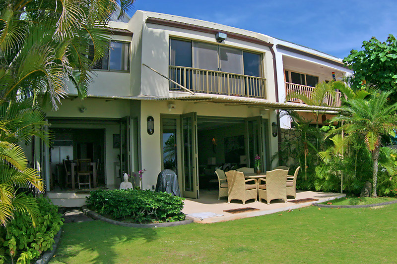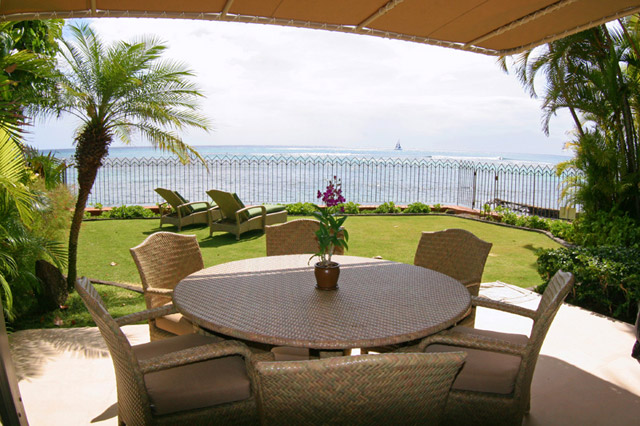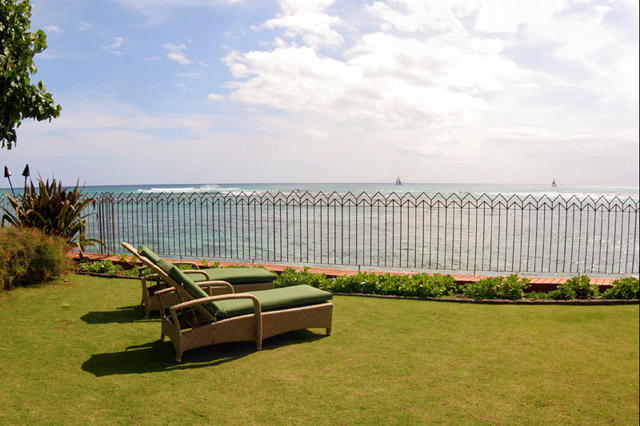 A tropical hideaway where guests can lounge on the seaside lanai, sunbathe in the lush grassy yard or stroll to the beach just steps away. This oceanfront duplex home offers the perfect setting for a vacation in Paradise. The home is appointed with upscale tropical furnishings, central A/C, limestone flooring and an abundance of windows to enjoy the wonderful views. Although extremely private, this home offers the convenience of being walking distance to Waikiki and Kapiolani Park.