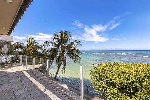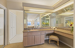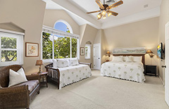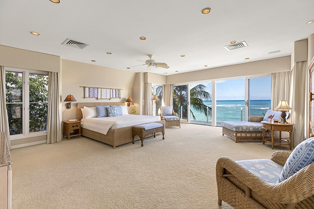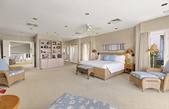 In the first master suite on the third floor, guests will find a king bed, a balcony lanai, and an ensuite bath featuring a jetted tub and walk-in shower. A second master suite is also available on the second floor, complete with a king bed, a full day bed, and another ensuite bath. Additional guests have the option to reside in the third downstairs bedroom, furnished with two twin-sized beds and the third full bathroom.