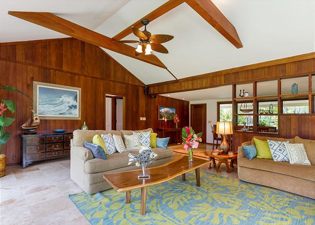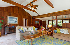 The main home offers three bedrooms and two baths overlooking an expansive grass lawn with the beach and ocean beyond.