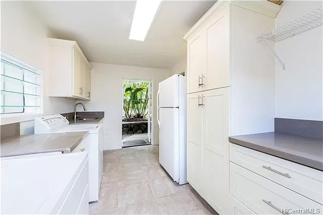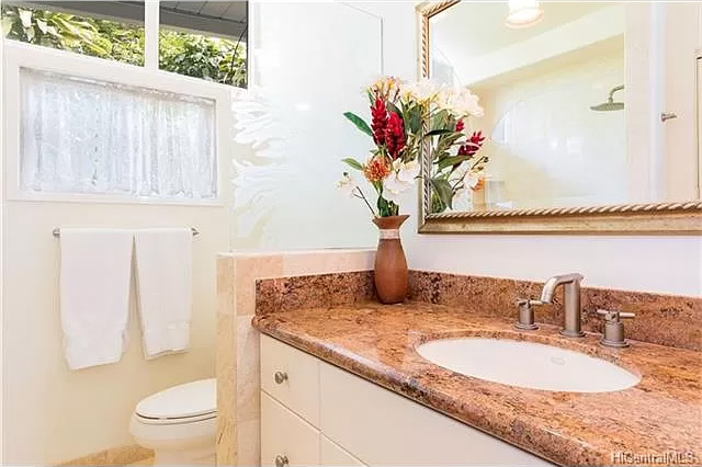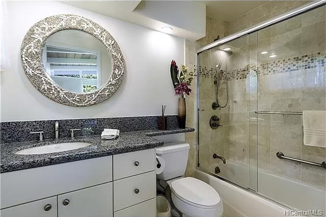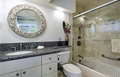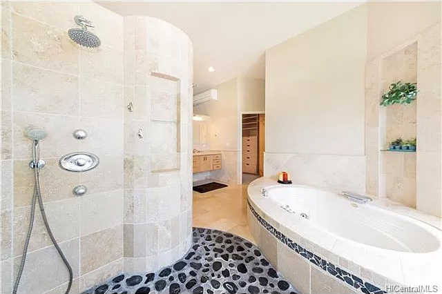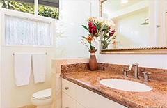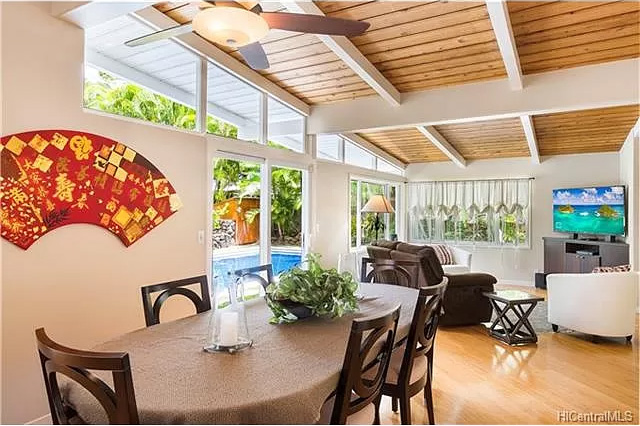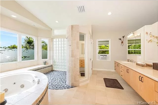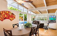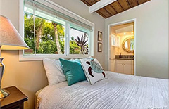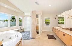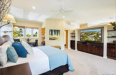 The master bedroom is located upstairs featuring a large bedroom with flat screen TV, private lanai overlooking the pool area, Jacuzzi tub with etched glass and shower. The other two bedrooms are located downstairs, both have private baths. While the lower den/office is also air conditioned with pull out sofa bed. The sliding glass doors open up the tropical garden and pool area.