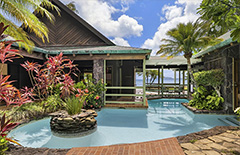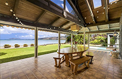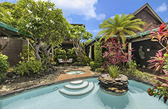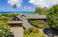 Gated access and a long roundabout driveway lead to the grounds of Maunalua Sunset estate, where the central courtyard, meandering resort-style swimming pool, and jacuzzi create a focal point for guest gatherings. Along with covered patios and walkways winding among the structures, this peaceful retreat offers an oceanfront yard with places to lounge in sun or shade.