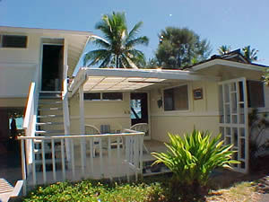 Simple oceanfront cottage decorated with Island style furnishings with fantastic views of the ocean from almost every room. Perfect for two couples or a small family with one bedroom located in the main house while the other large ocean view suite is up a small flight of stairs with private entrance. Easy access down to the calm waters of Lanikai via the shared stairway.