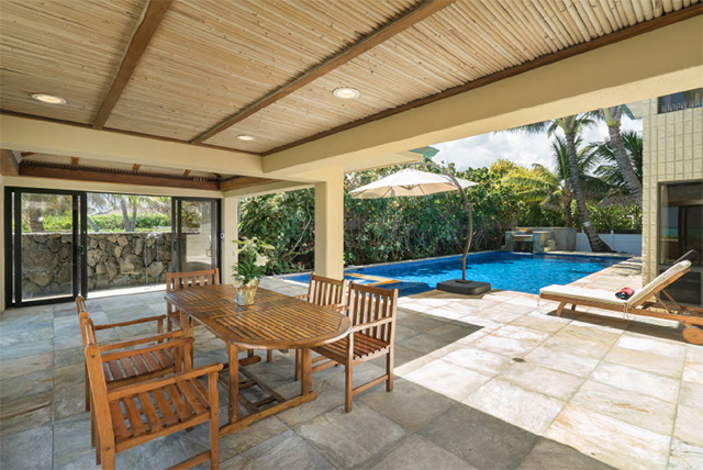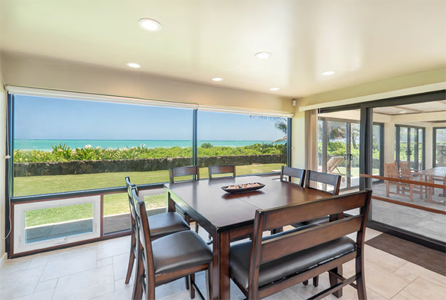 Along the white sand beach of Kailua, Ocean House offers the best of the location. Two stories of panoramic picture windows highlight the gorgeous blue horizon while you relax in the spacious and comfortable living room The dining room and generous kitchen connect seamlessly to the pool deck with its own shaded dining area. The deck is conveniently protected from on-shore winds—allowing you to enjoy the outdoors and sapphire blue pool and spa in any weather.