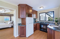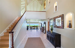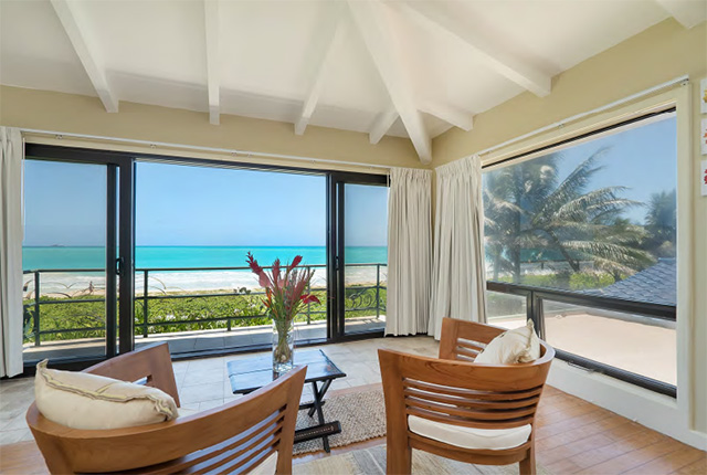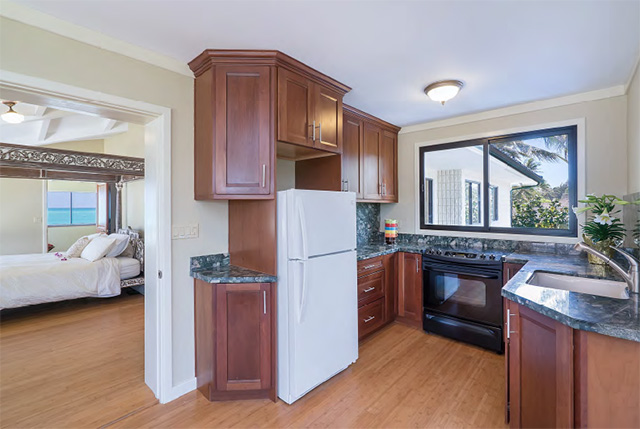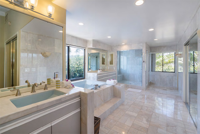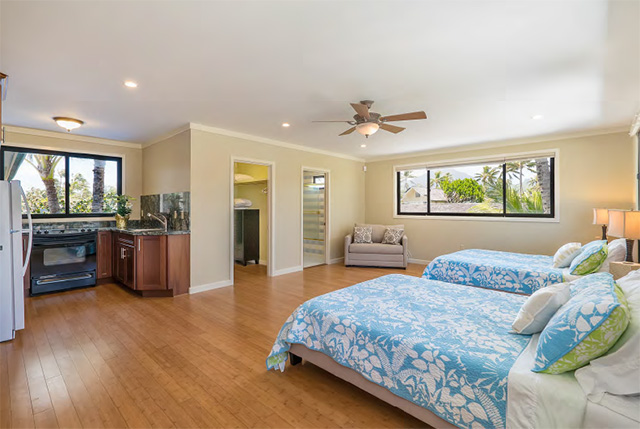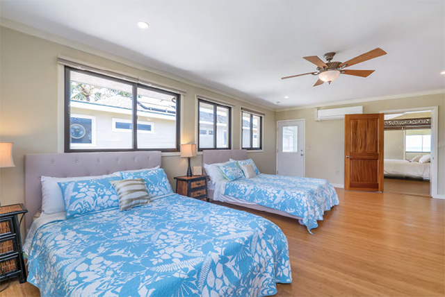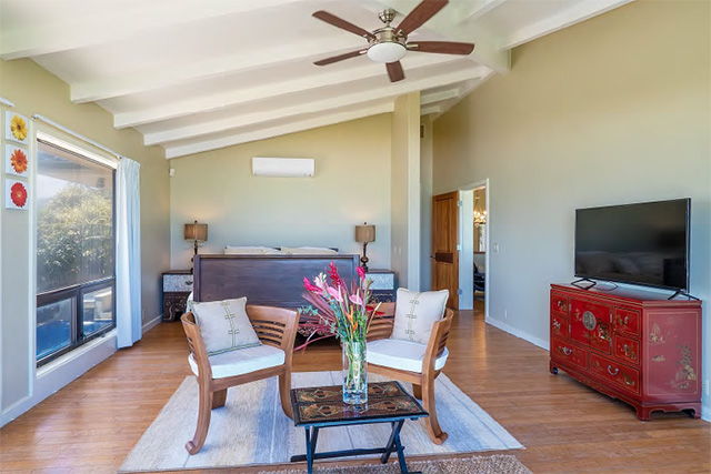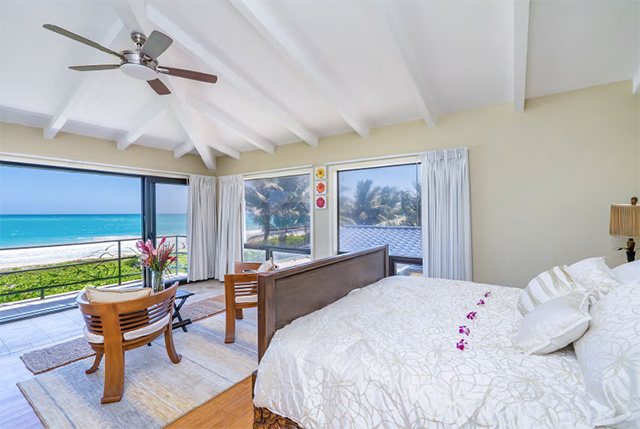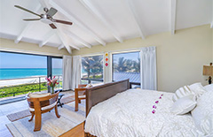 The house includes five bedrooms and richly carved wood furniture, adding an exotic appeal to the natural outdoor beauty. Upstairs master includes a private Oceanside lanai, king bed and full bath overlooking the pool.