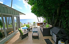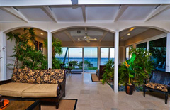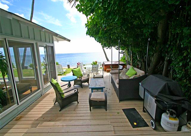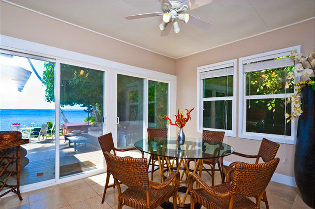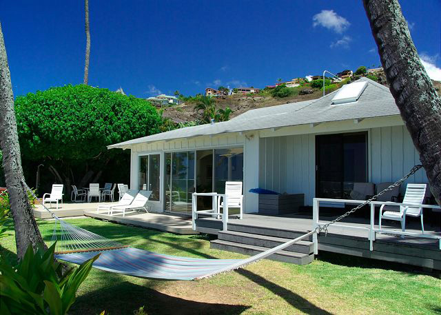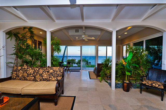 Comfortable single-story home located on Oahu's sunny south shore. This home features a large sunken living room with cool tile flooring and multiple rooms which open to the ocean. The front of the house has a grass yard that spills down to a private beach accessible by the few upscale homes located along the beach.